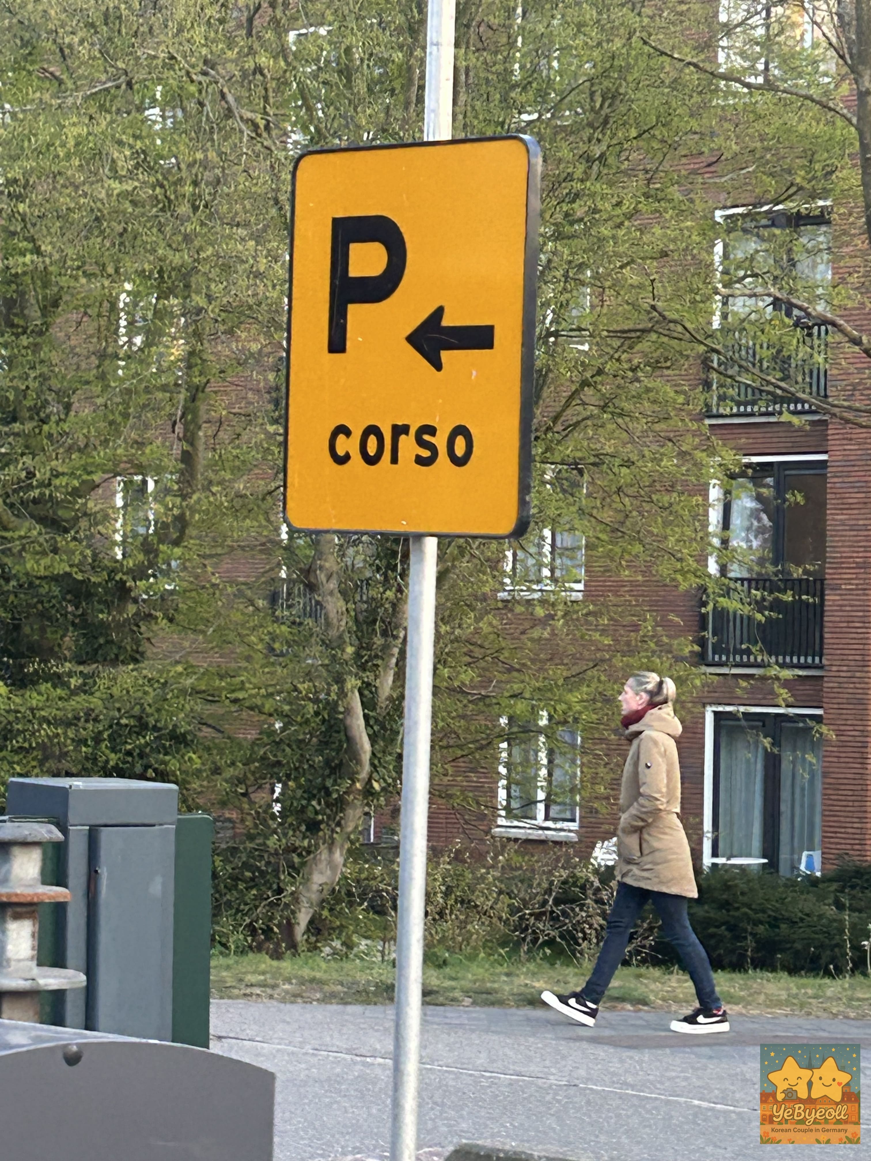 P=Parking (주차), Corso = 퍼레이드, 꽃행렬, 화살표방향: 해당주차장 위치를 알려주는 방향