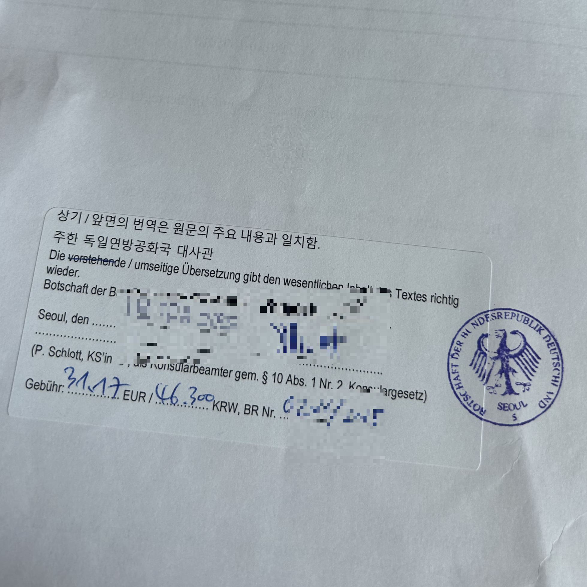 3. 아포스티유 공문서+번역본 들고 주한독일대사관 방문! (여권포함 신분증 2개! 현금 필수!!!)