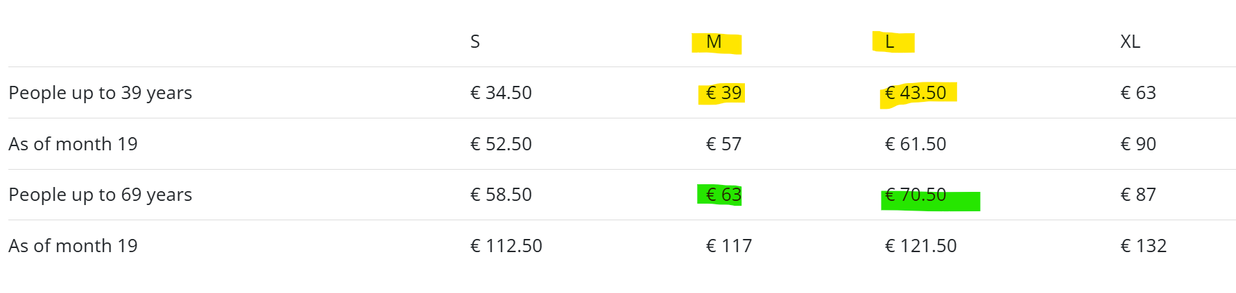 (많은 블로거들도 혹시나하는 마음에 XL를 선택하는 사람들도 있던데, 그 정도까진 할필요없을거같다. M과 L은 월 4.5유로 차이만 나지만, L-XL는 월 20유로 차이나 난다!)