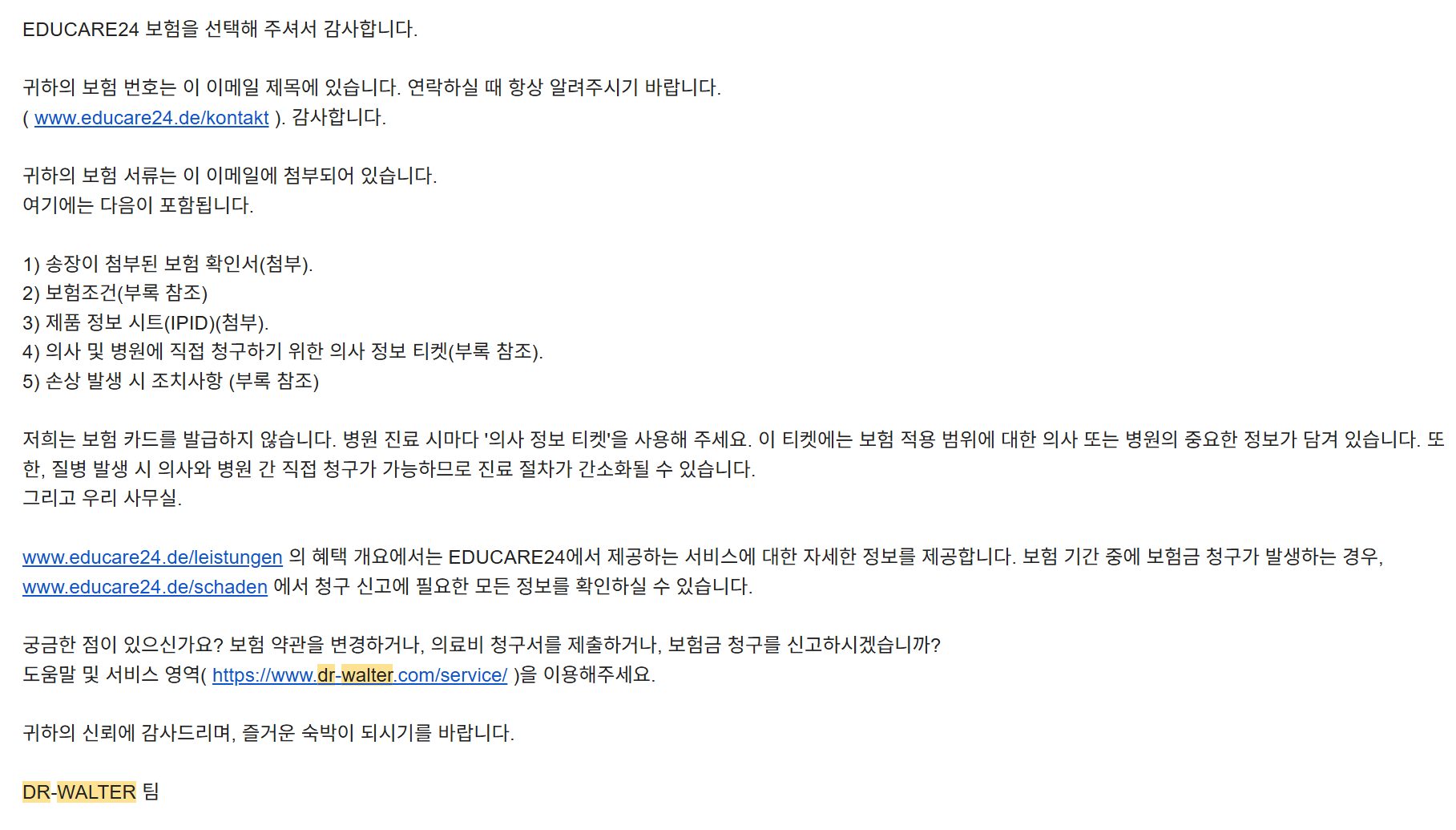 열심히 검색을 해보니, 독일 거주허가를 받기위해 많은 사람들이 닥터발터 보험 상품들 중에서, '에듀케어24(EDUCARE24)'를 많이 하는데, 사실 이 보험 상품은 이름부터 'EDU'가 붙은 만큼 유학생들을 위한 상품이다. 그래서 처음에 가성비로 이걸 가입하려다가, '나는 학생이 아닌데...?? 거주허가 서류에서 이것 때문에 떨어지는거 아니야..??'라는 생각이 들었다. 근데, 또 닥터발터 에듀케어24(EDUCARE24) 상품 설명란에는 '학생', '인턴', '구직자'를 위한 보험 상품이라고 써있다. 나는 구직자도, 인턴도, 학생도 아닌데? 한번 닥터발터에 도대체 나는 무엇을 가입해야되냐고 이메일을 보내봤다.