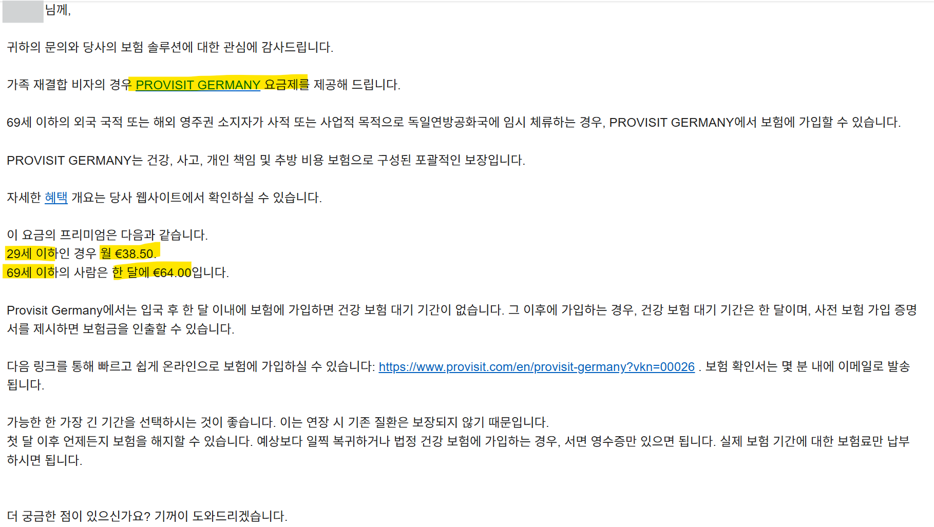 닥터발터의 공식 이메일로는 가족재결합비자의 경우엔 'PROVISIT GERMANY'상품을 추천한다고 했다.