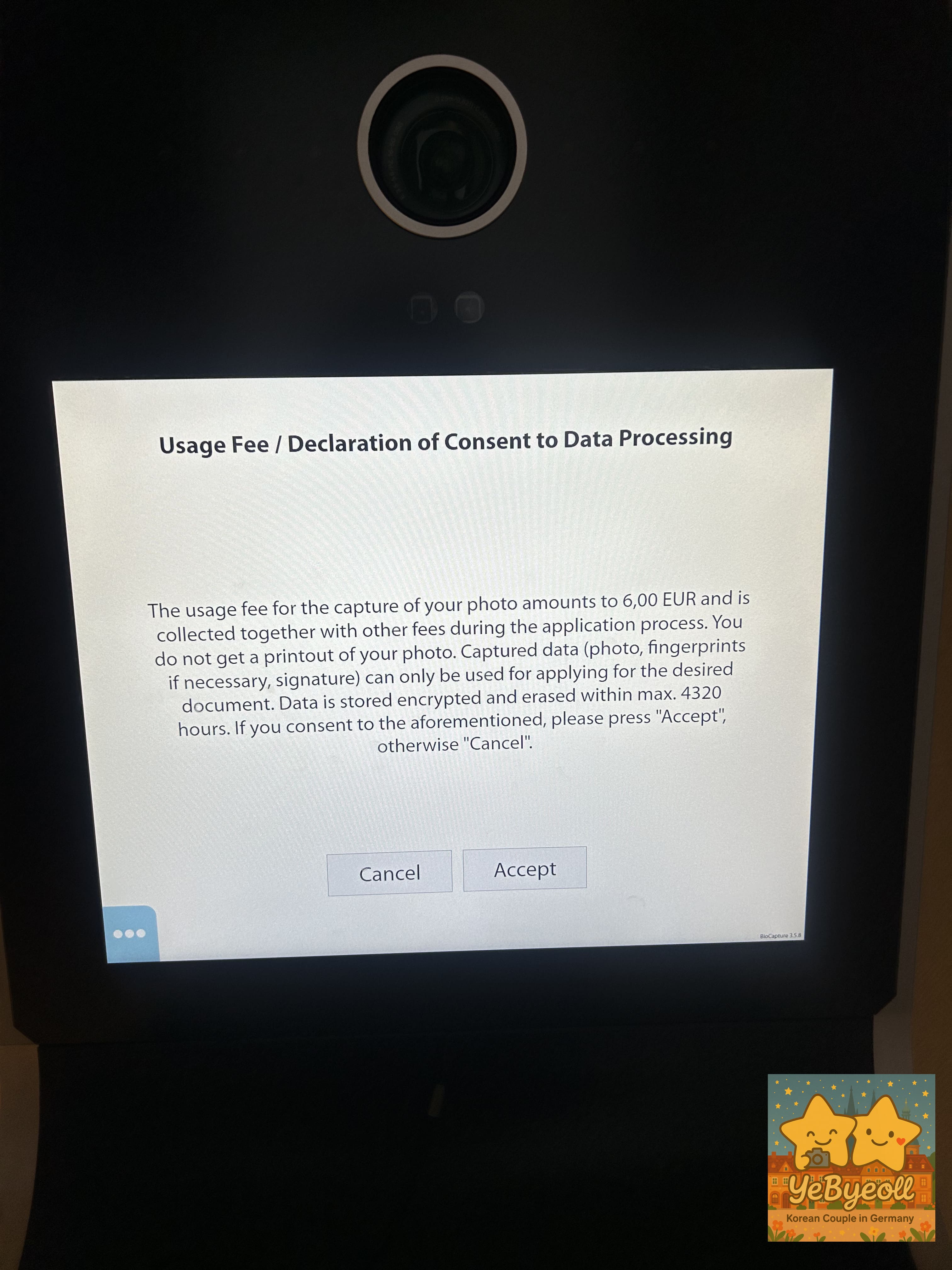 원칙적으로는, 이 생체인식 여권사진을 찍기 위해서는 출입국 관리사무소에 6유로의 수수료를 내고 촬영할 수 있다고 했다.