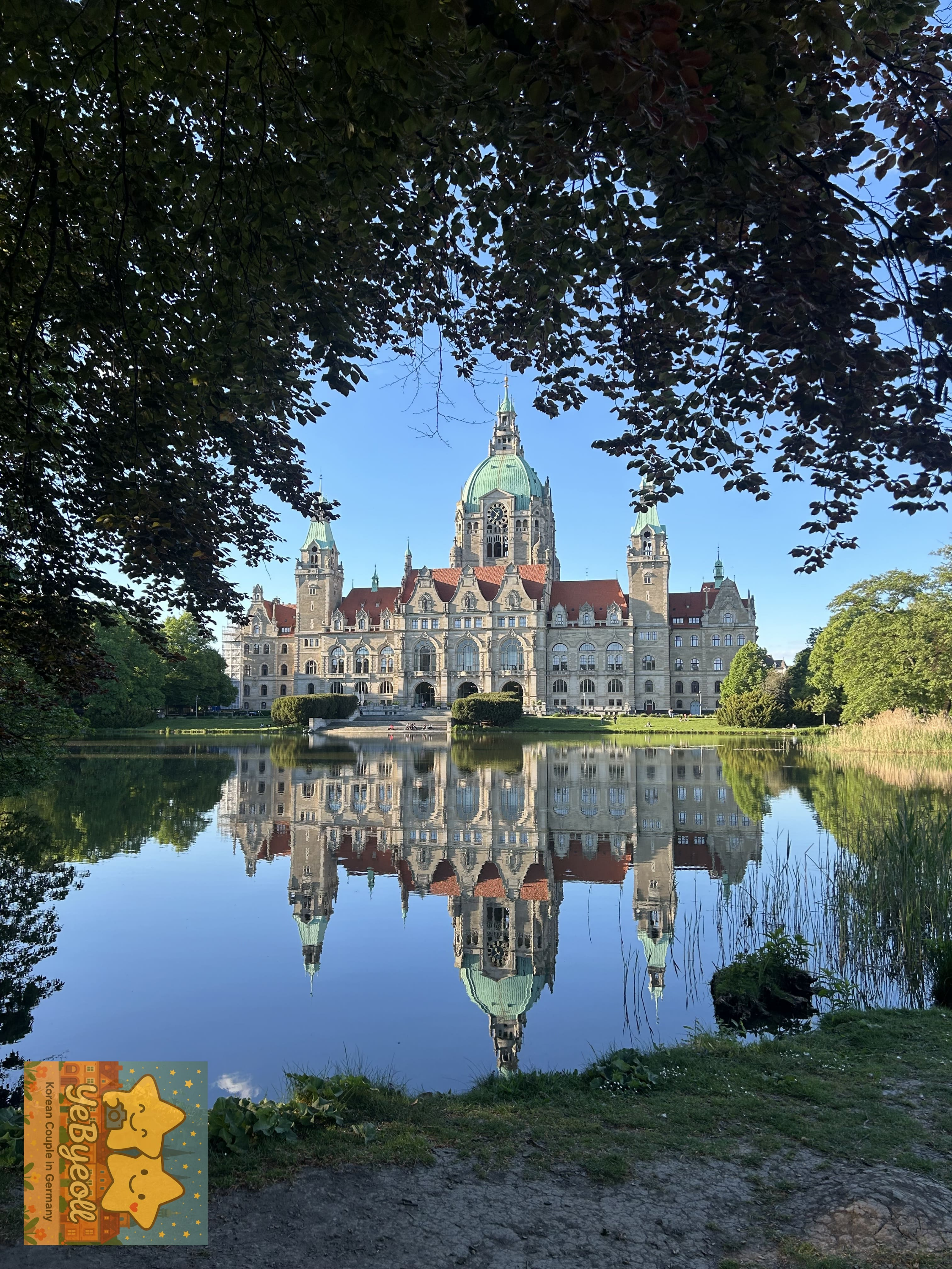 우리가 독일에서 살고있는 커플이라, 거의 대부분의 유럽도시의 시청사들이나 성당들에 익숙해져있는 상태라.... 딱히 신시청사 건물자체에 대해 예뻐보일거라 생각하지 못했다. 하지만, 하노버의 신시청사는 신시청사 건물만 있는게 아니라 앞에 작은 연못+공원이 있기 때문에 정말 예뻐보였다. 특히, 물에 비친 신시청사의 건물!!