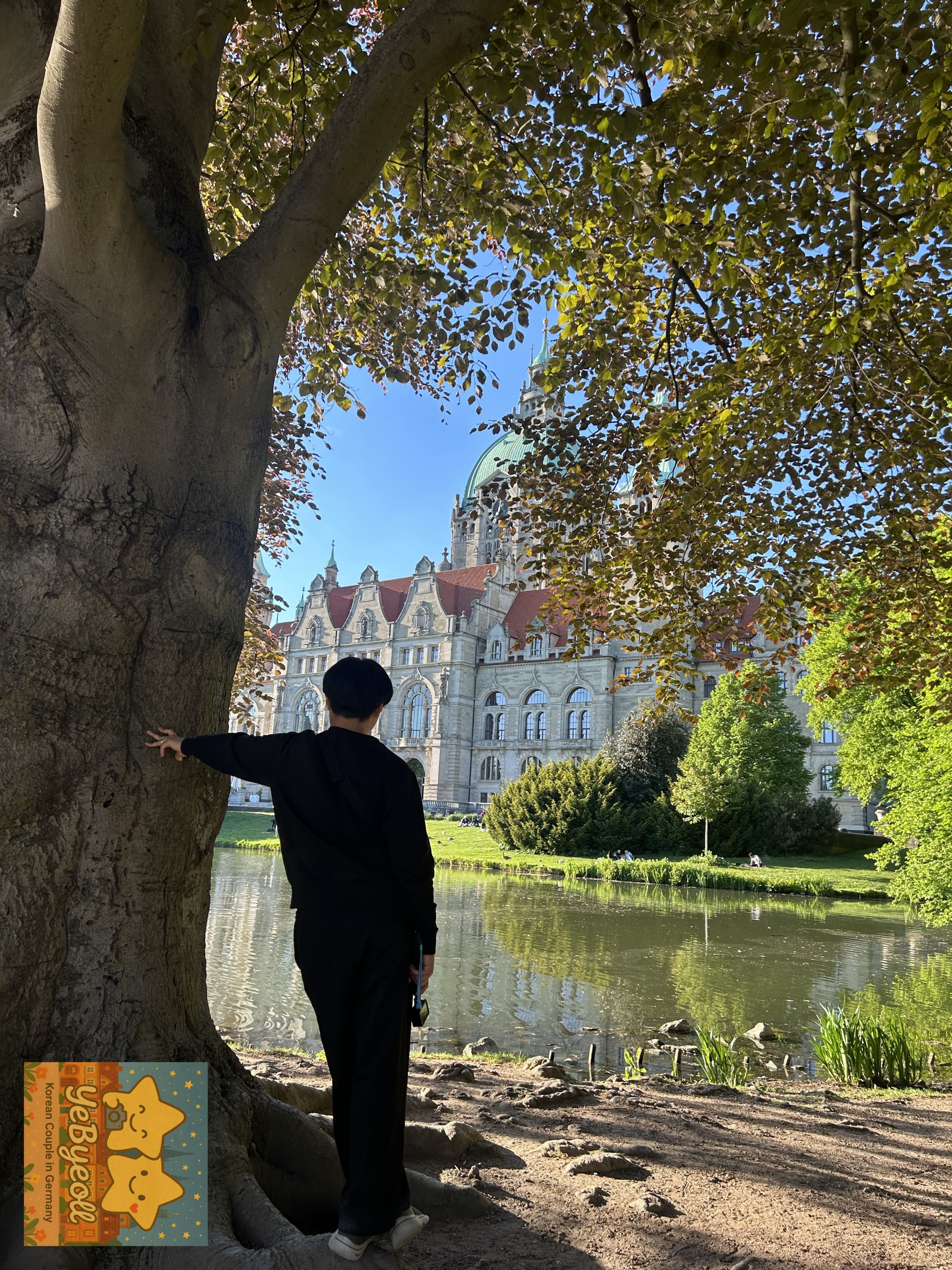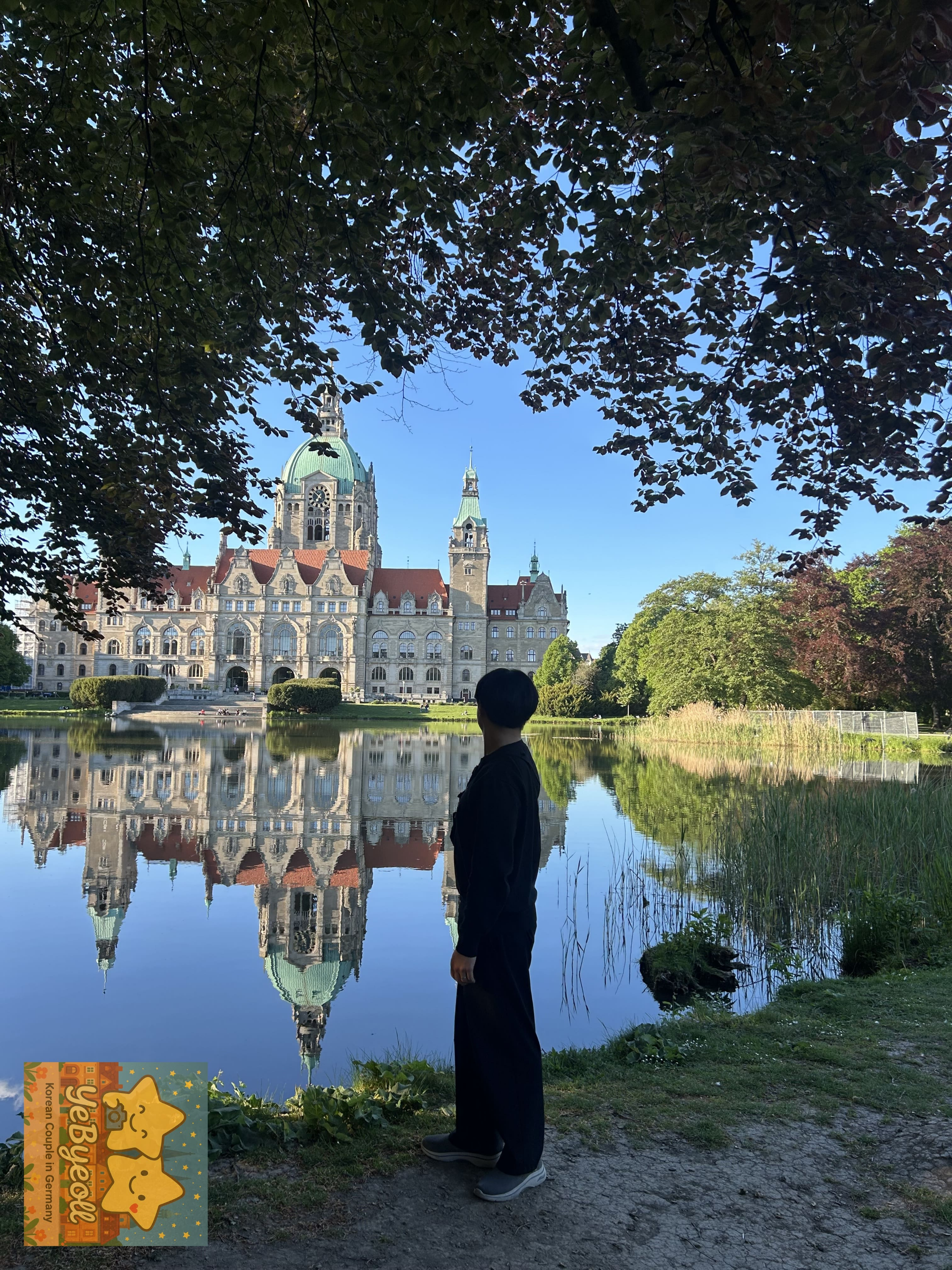 우리가 독일에서 살고있는 커플이라, 거의 대부분의 유럽도시의 시청사들이나 성당들에 익숙해져있는 상태라.... 딱히 신시청사 건물자체에 대해 예뻐보일거라 생각하지 못했다. 하지만, 하노버의 신시청사는 신시청사 건물만 있는게 아니라 앞에 작은 연못+공원이 있기 때문에 정말 예뻐보였다. 특히, 물에 비친 신시청사의 건물!!