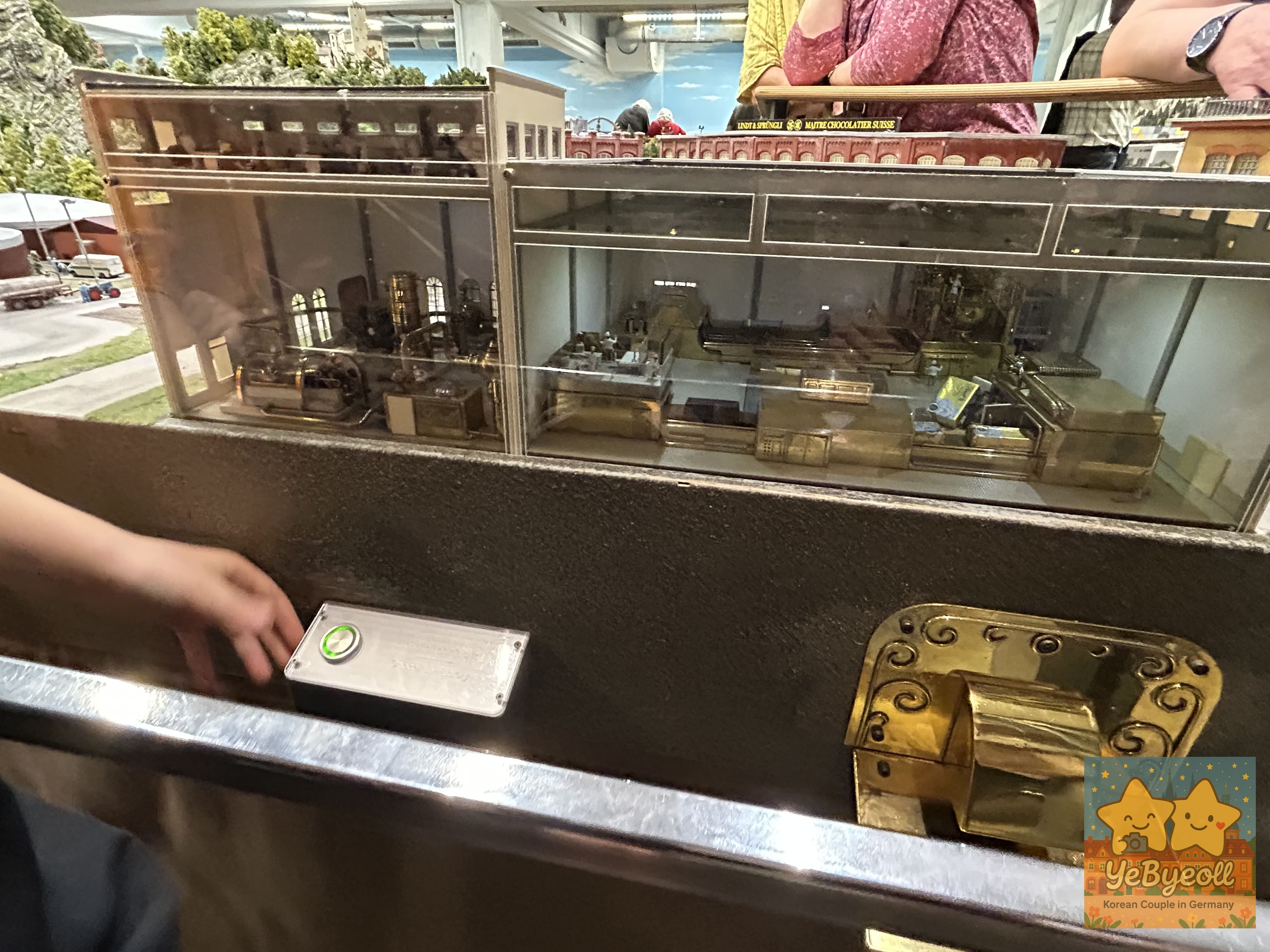 그와중에 이 린트초콜렛공장 미니어쳐 앞에서! 이 버튼을 누르기위해 어떤 아이가 있는걸 봤어요!